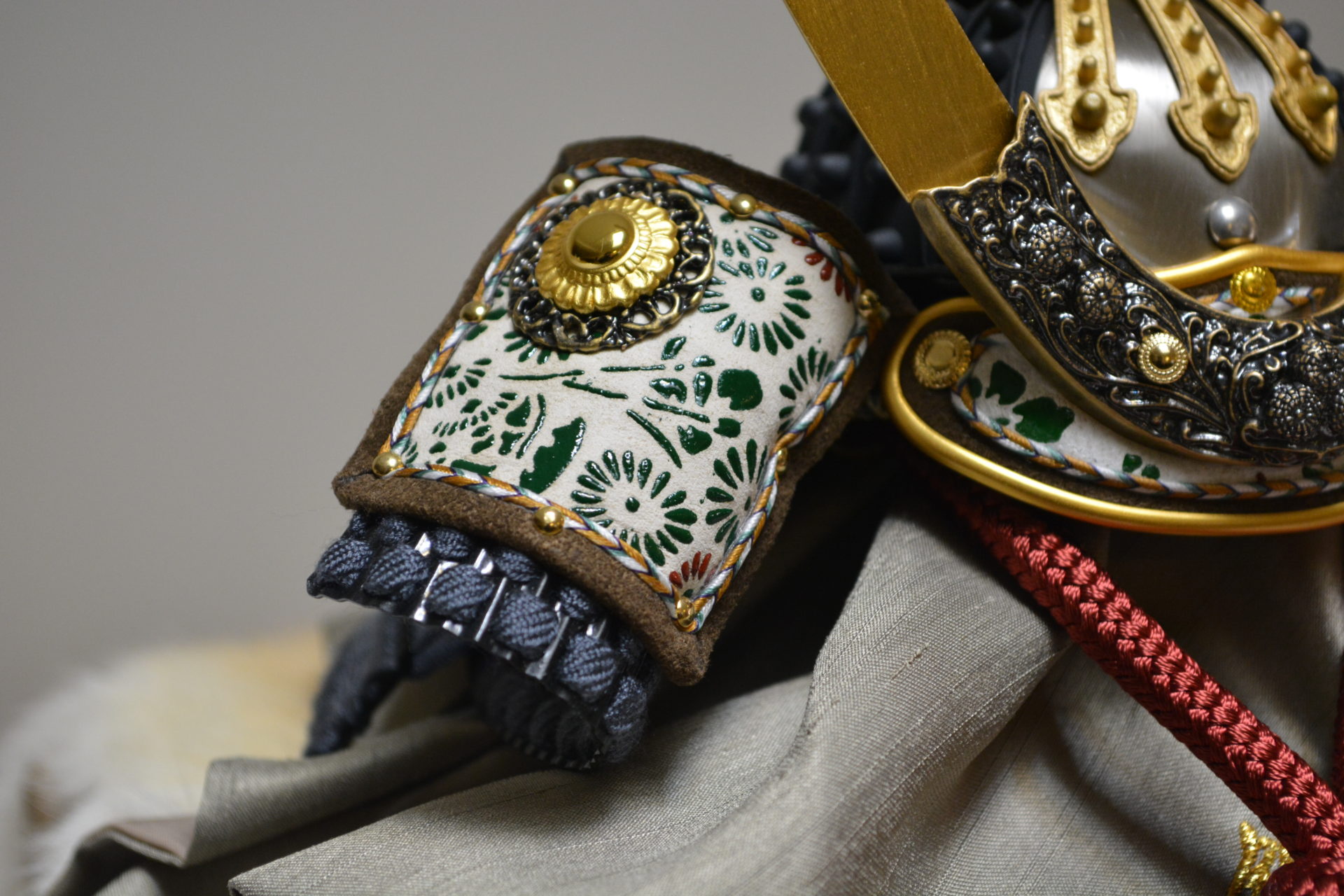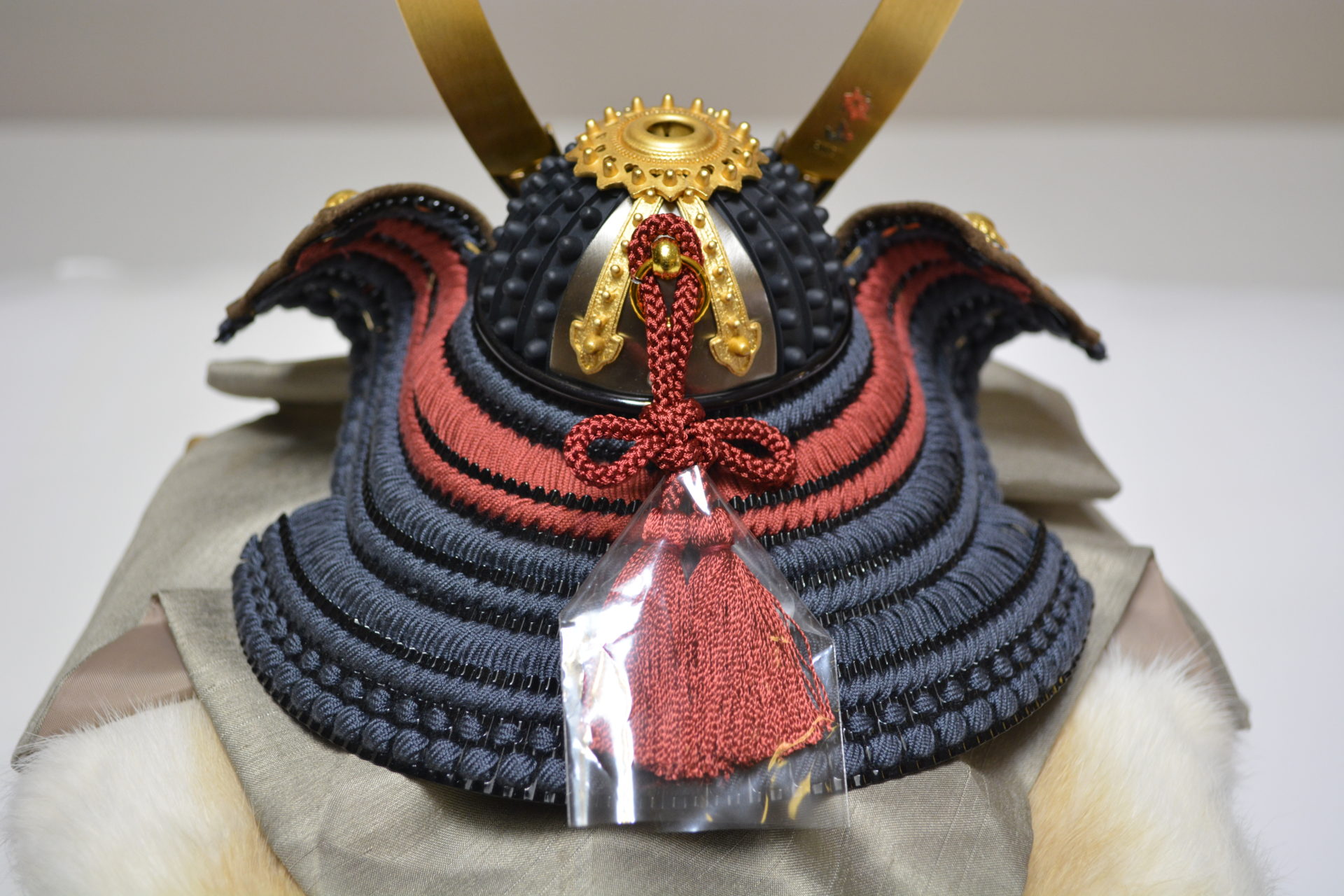 黒の小札の鉄紺と茜色の正絹糸を縅し制作いたしました。現代の住空間にマッチするスタイリッシュな兜飾りです。