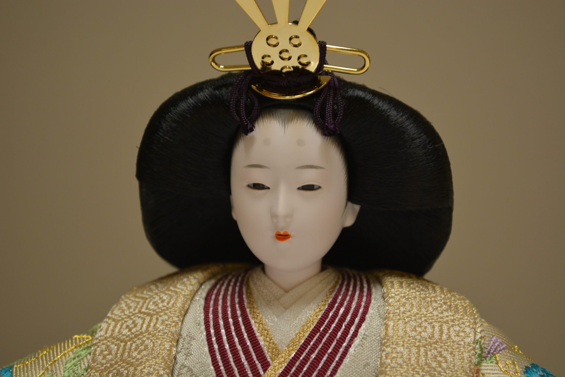 落ち着いた佇まいの殿と華やかな姫の高級裂地を丁寧に仕立て本式に着せ付けました。赴きある桜の屏風・吉徳大光オリジナルの端正なお顔が美しく融合した豪華な雛飾りです。
