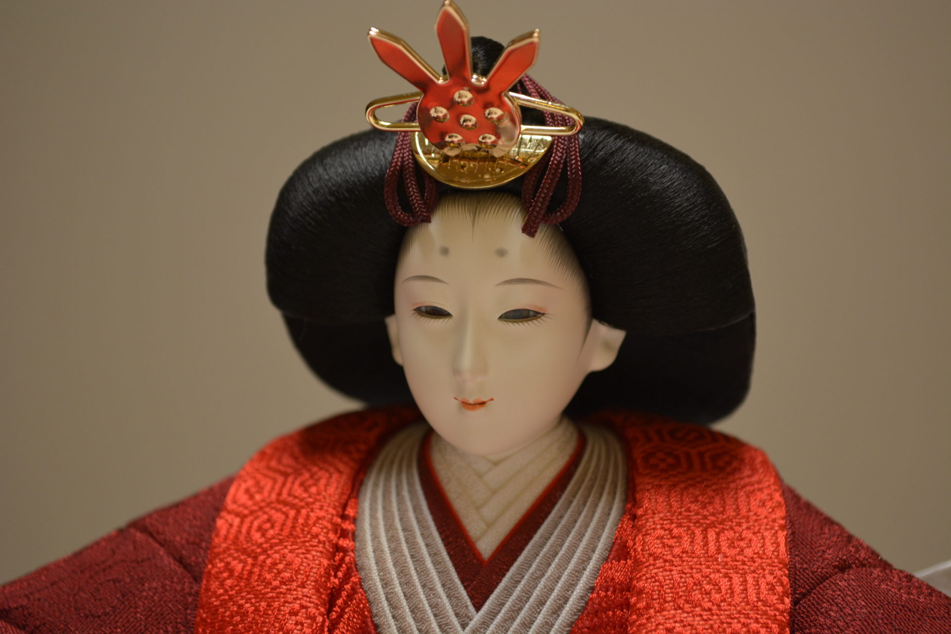 節句人形工芸士・秋葉聡の逸品。落ち着いた色彩の殿とレトロな赤い衣裳をまとった優雅な縫取り縮緬生地を着せ付けたお雛様、高級感ある本格的な一揃いです。