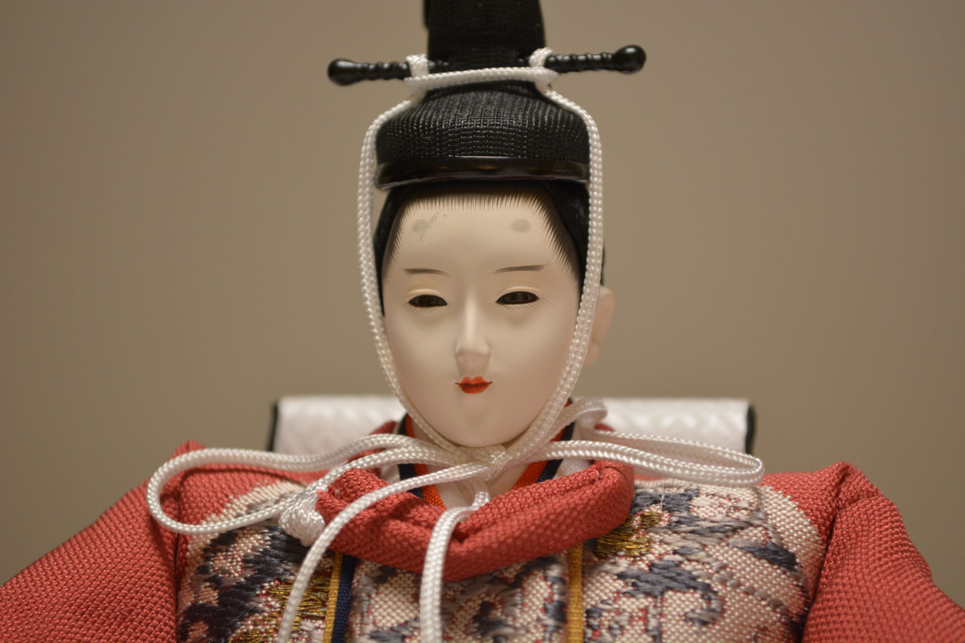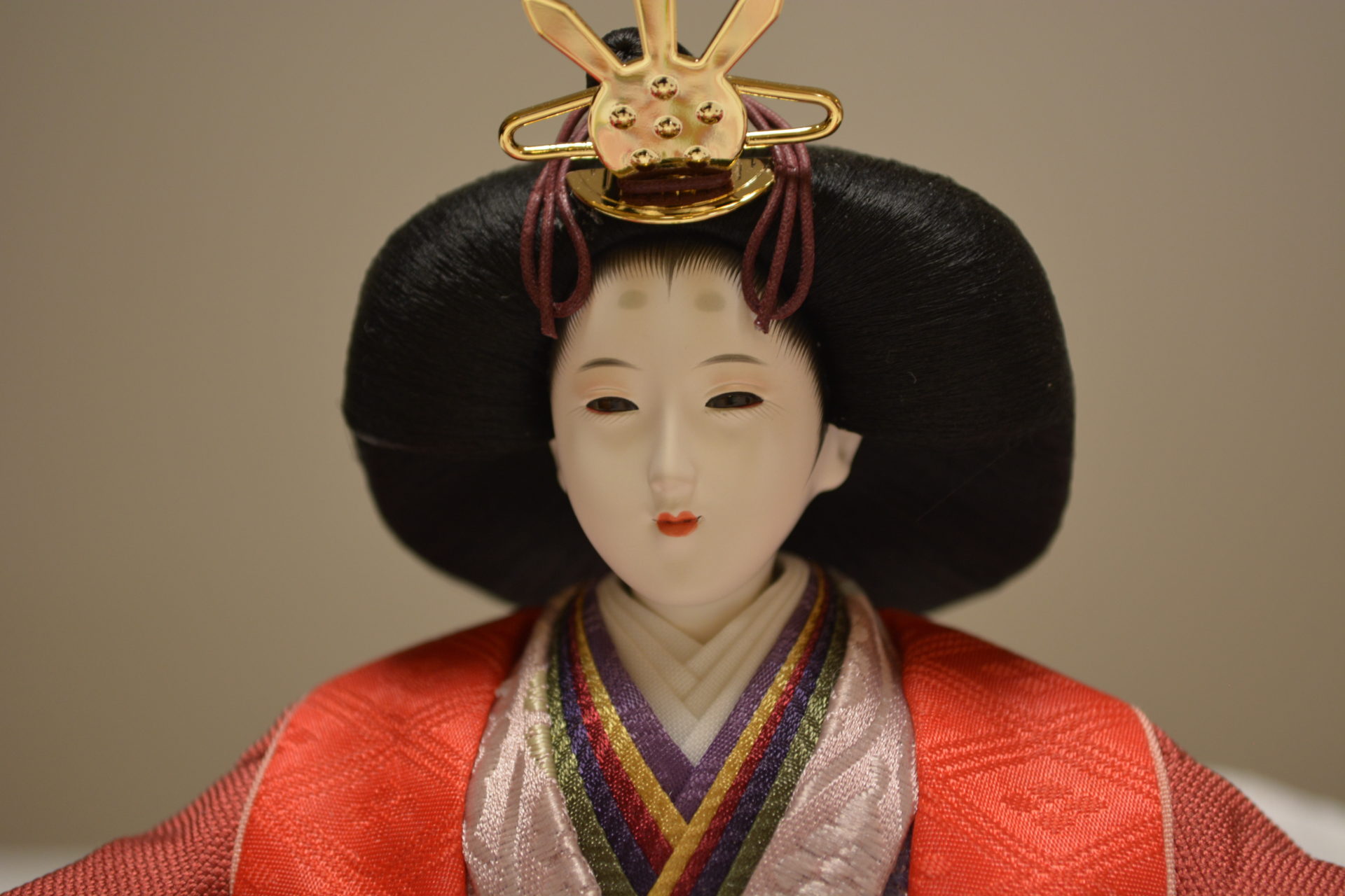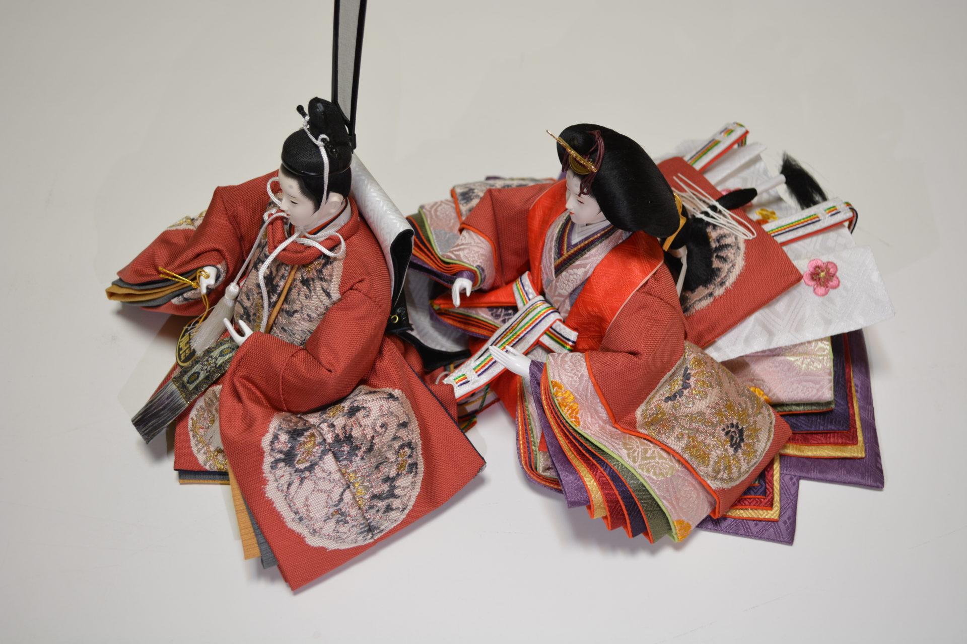 伝統工芸士・飯塚孝が高級感ある帯地衣裳をボリューム感ある着せ付けで制作いたしました。白木の自然な風合いの飾り台屏風との相性も抜群のかわいらしい飾りです。