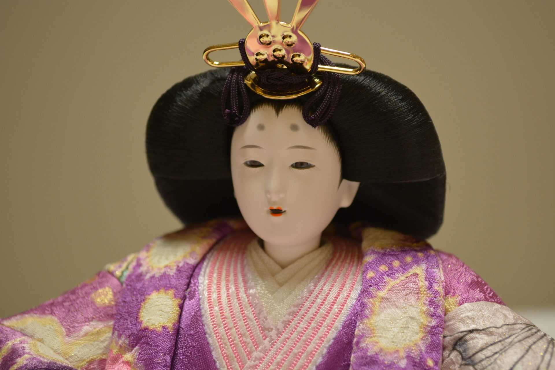 高貴な色紫を基調とした正絹辻が花の衣裳を本式に着せ付けたお雛様。シックでモダンな飾り台・屏風が綺麗に人形を引き立てる逸品です。