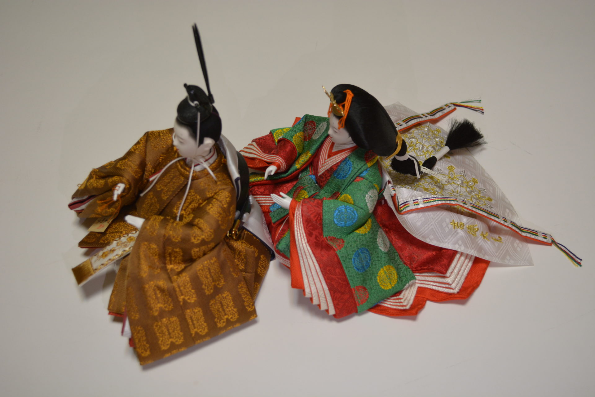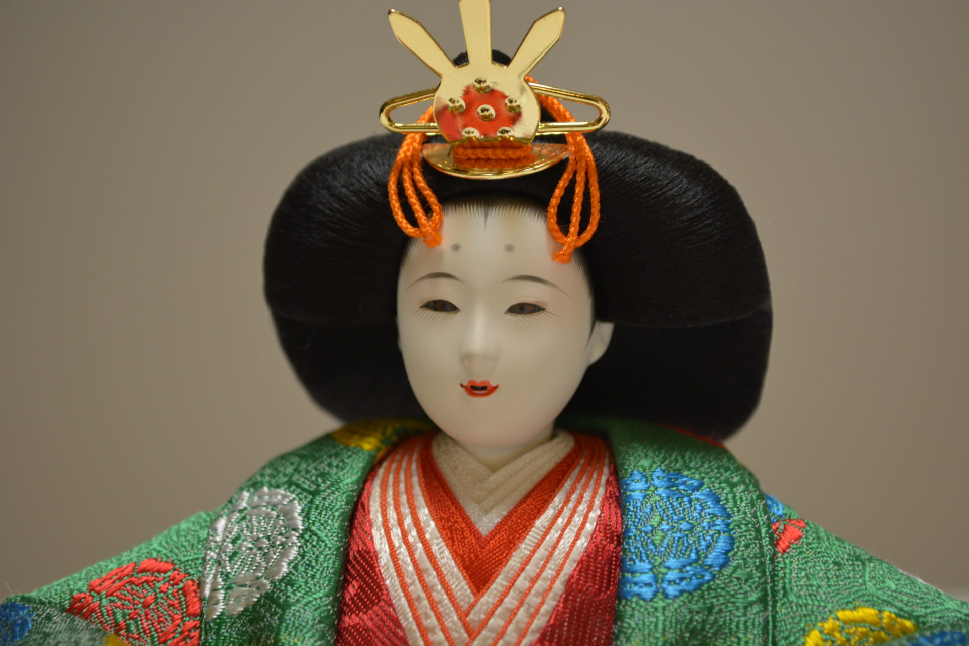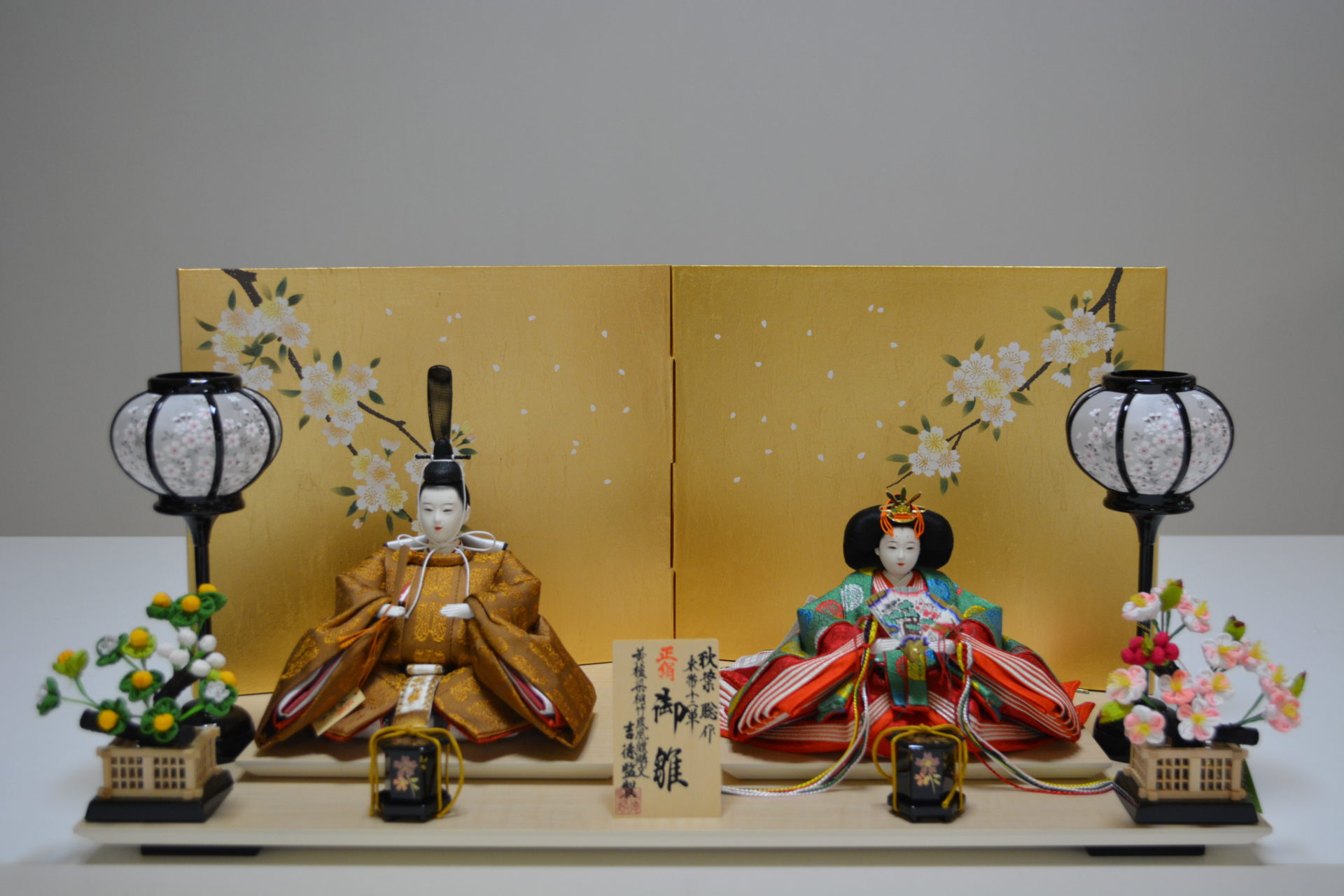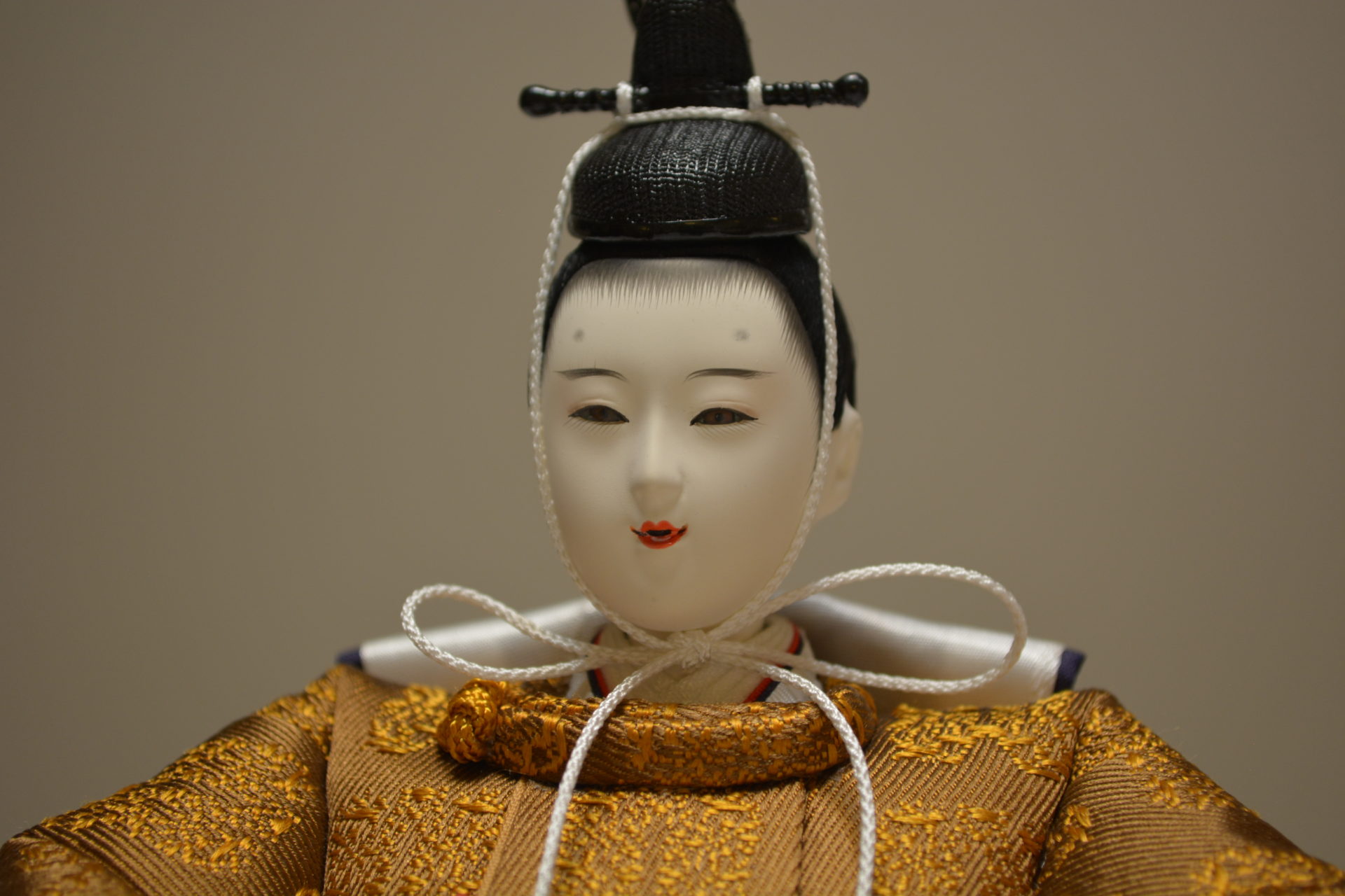 天皇陛下のみが着用される黄櫨染の御袍と華やかな有職裂地を丁寧に仕立て着せ付けました。枝桜金箔コーティング屏風木目調の飾台・吉徳大光オリジナルの端正なお顔が美しく融合した逸品です。