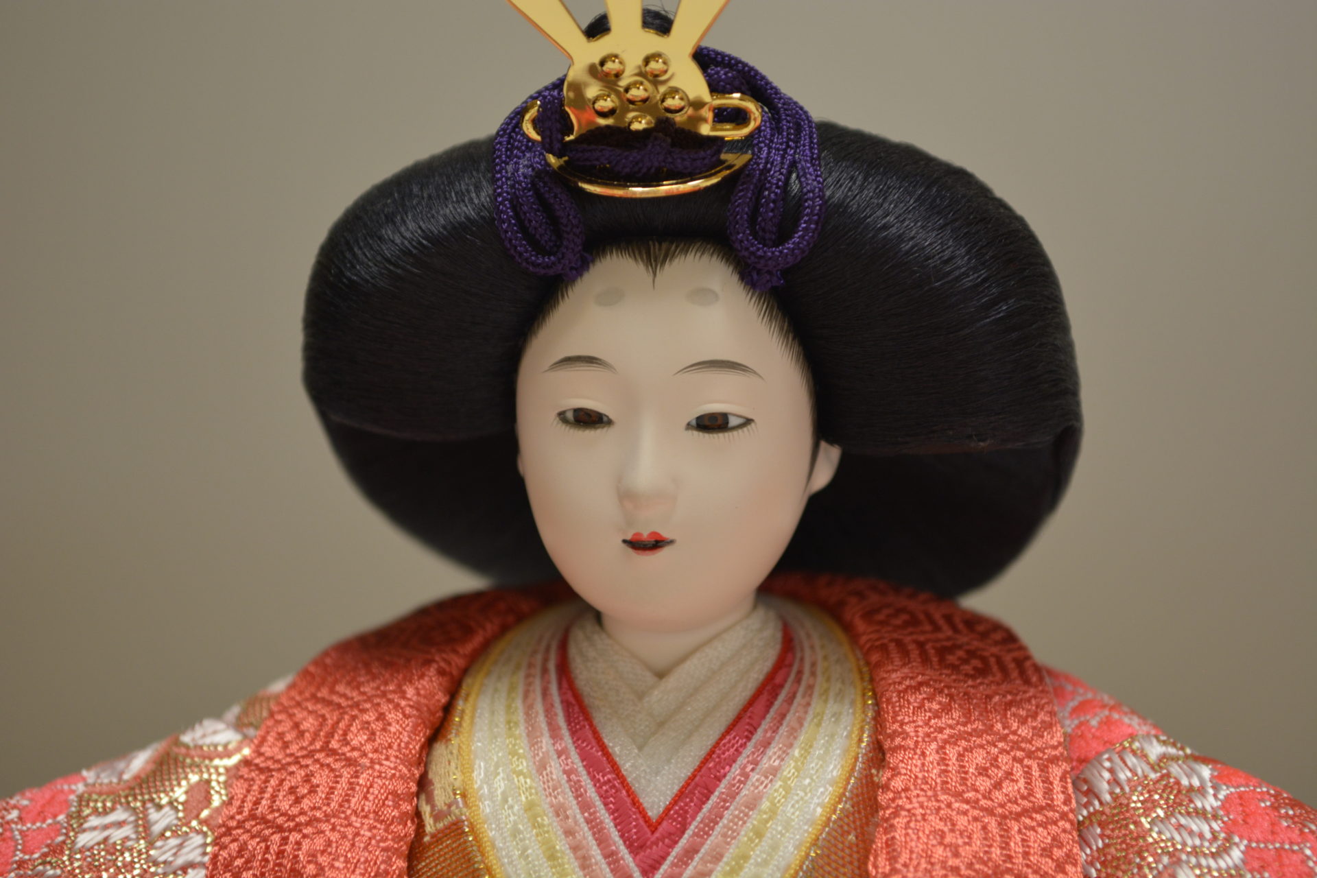 屏風の縁に唐草の蒔絵飾台はシンプルにワイン色に塗り上げました。豪華な金襴衣裳を着せ付けたお雛様が華やかで格調高い収納飾りです。