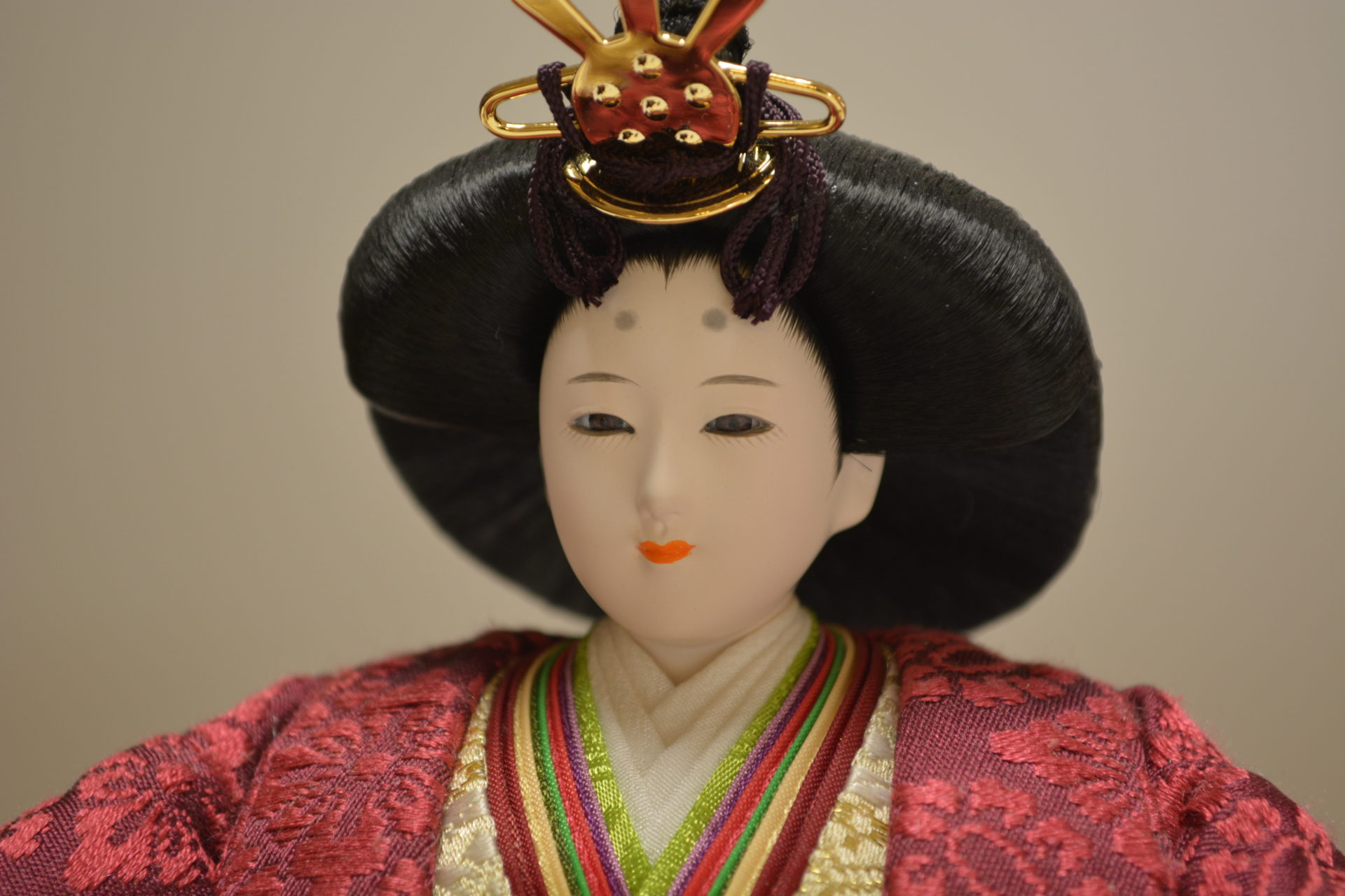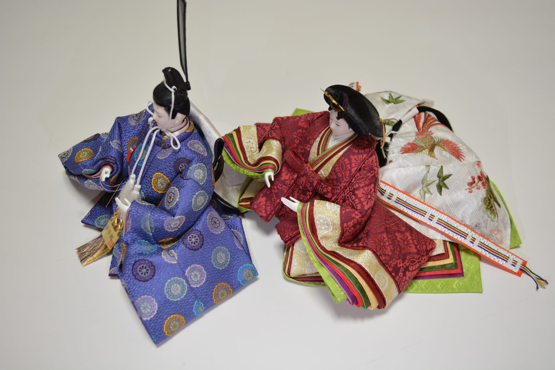 殿には青紫姫には茜色の有職文様の衣裳を着せ付けました。総桧の飾り台、屏風には美しく桜を散りばめました。