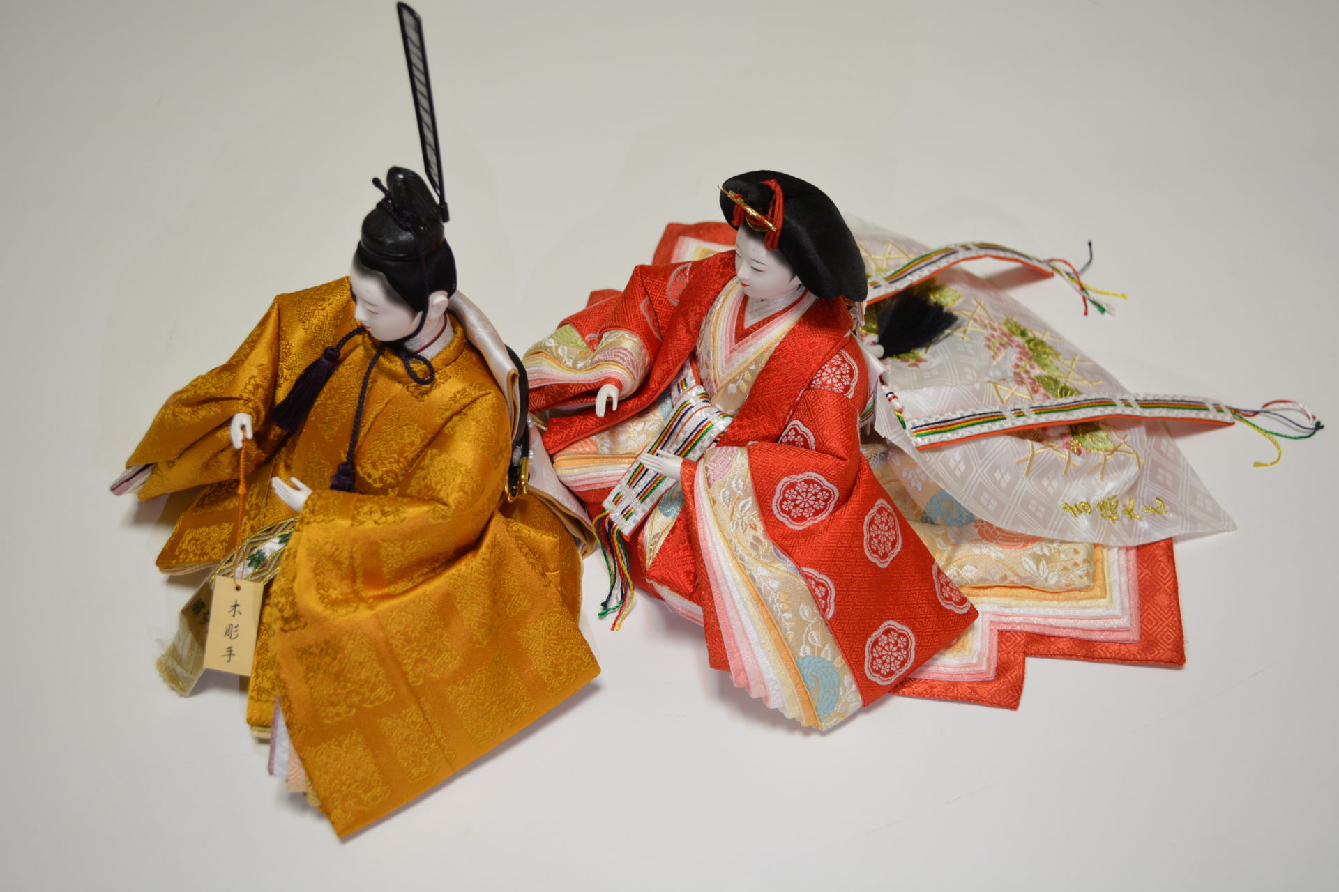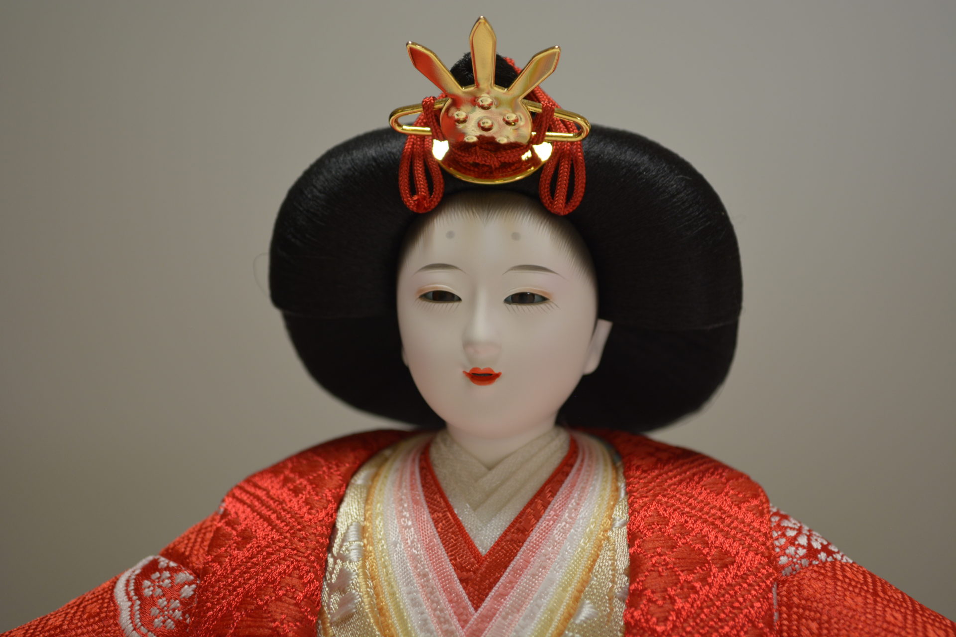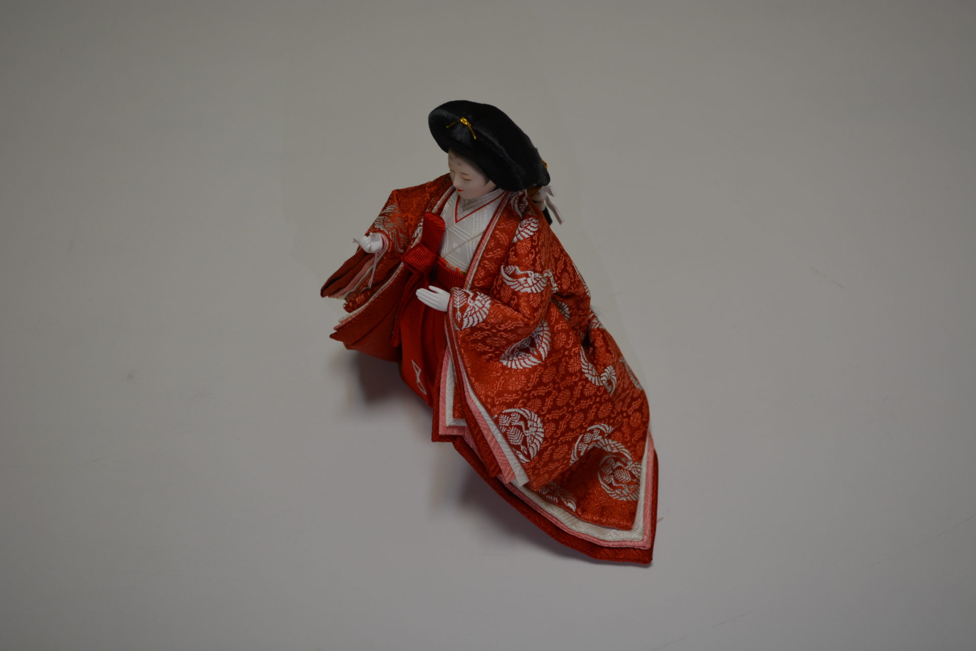お殿様の衣裳は天皇陛下がお召しになる黄櫨鮮やかな赤色の有職文様を丁寧に仕立て着せ付けました。屏風には細やかな格子が施され、窓には吉祥を象徴する鶴が大空に舞いあがっています。末永く色あせない古典美溢れる雛飾りです。