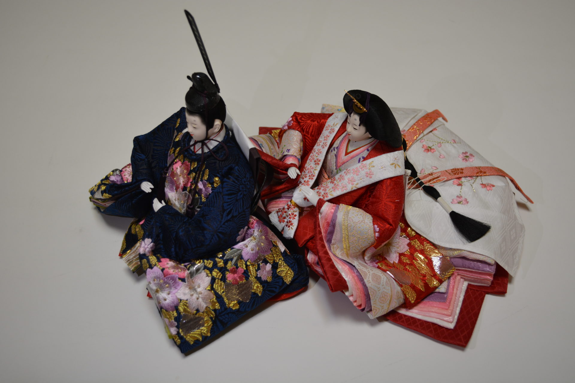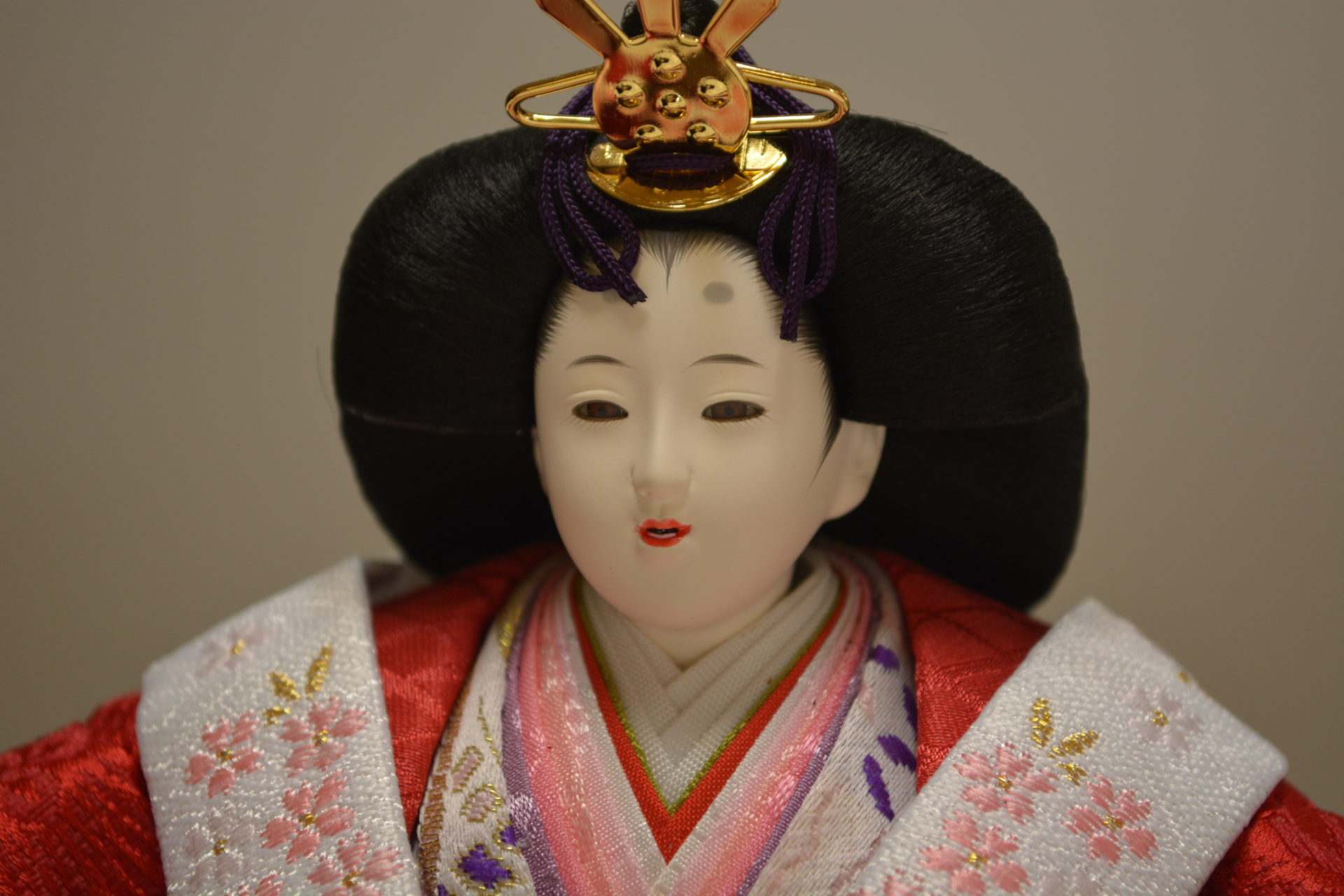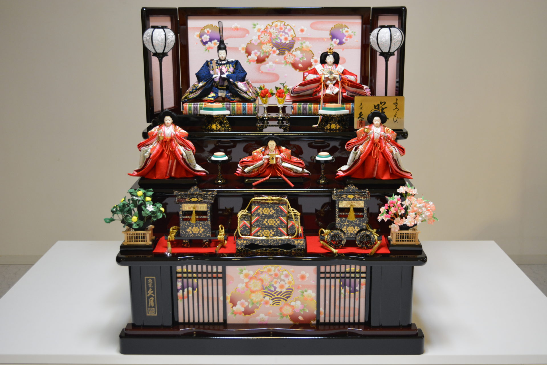 美しいワイン色の色彩で仕上げられた飾台。可愛らしい金彩桜の屏風にあでやかな刺繍衣裳のお雛様が生える一揃いです。